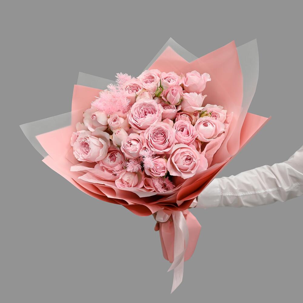 Роза кустовая пионовидная – 7 шт.аспарагус стабилизированный – 2 шт.Упаковка дизайнерская – 2 шт.