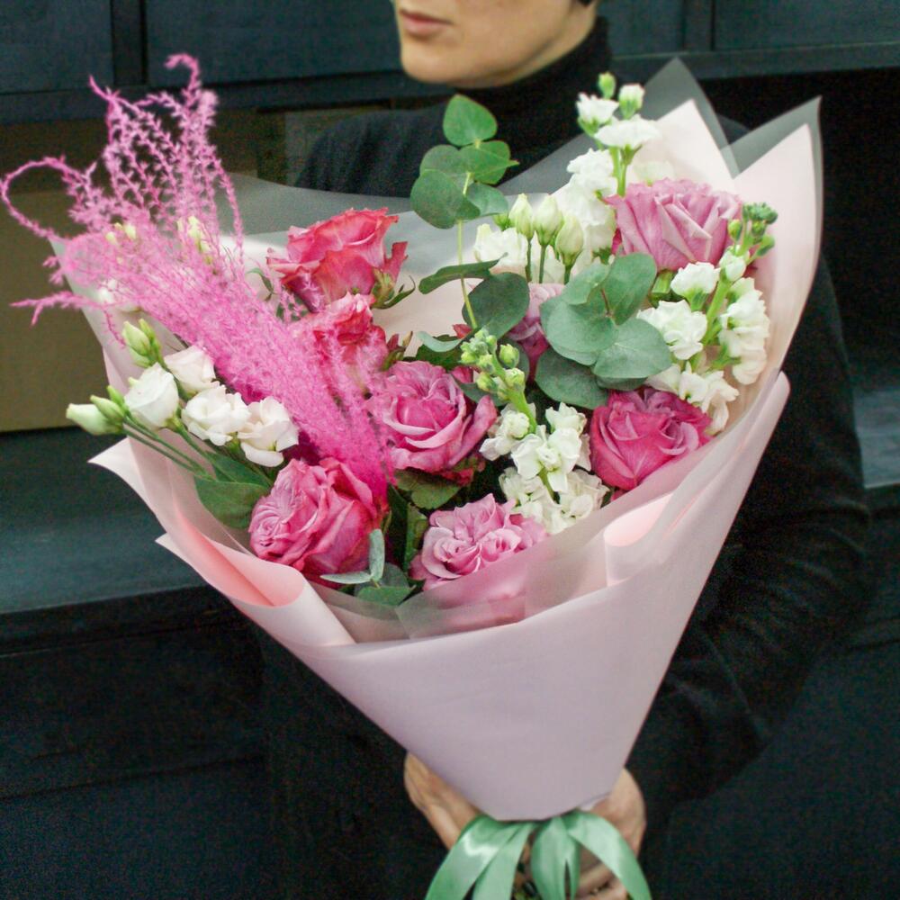 Лизиантус – 3 шт.Маттиола – 3 шт.Эвкалипт – 3 шт.Роза пионовидная – 9 шт.Дизайнерская упаковка – 1 шт.мискантус – 2 шт.