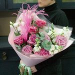 Букет из пион роз с эустомой (лизиантусом), маттиолой и эвкалиптом