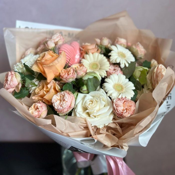 Гербера – 3 шт.Кустовая пионовидная роза – 5 шт.Хелеборус – 5 шт.Одноголовая роза – 4 шт.декоративная упаковка – 1 шт.Атласная лента – 1 шт.