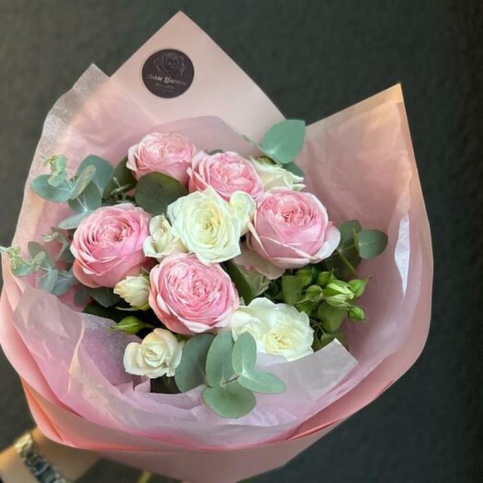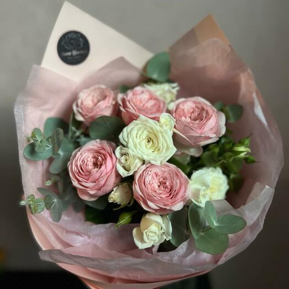 Пионовидная роза кустовая – 2 шт.кустовая роза жанин – 2 шт.Эвкалипт – 3 шт.декоративная упаковка – 2 шт.Атласная лента – 2 шт.
