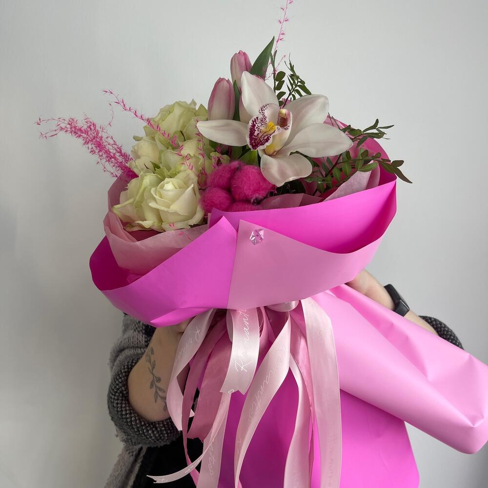 Роза – 6 шт.Тюльпан – 3 шт.Хлопок натуральный – 1 шт.Орхидея Цимбидиум – 1 шт.Тишью – 4 шт.Пленка матовая – 4 шт.Лента атласная – 4 шт.мискантус розовый – 1 шт.