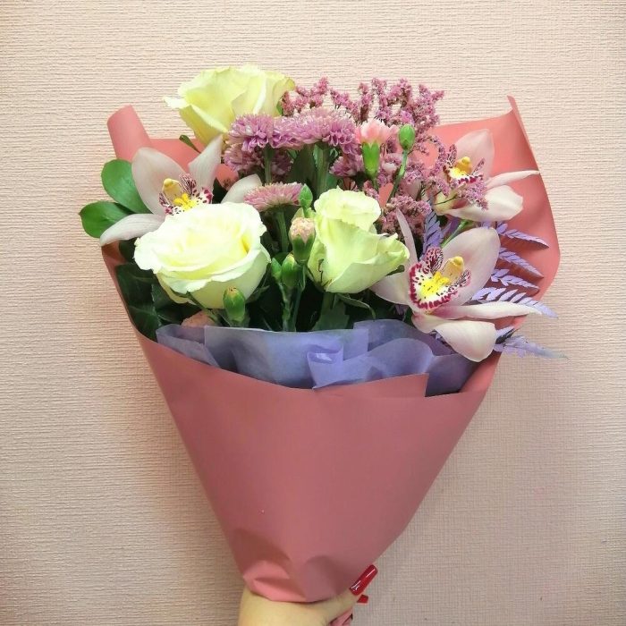 Лента – 1 шт.Лимониум – 2 шт.Папоротник – 1 шт.Хризантема кустовая – 1 шт.Роза Эквадор – 3 шт.Гвоздика – 2 шт.Упаковка дизайнерская – 1 шт.Рускус сочи – 4 шт.Орхидея цветок – 3 шт.