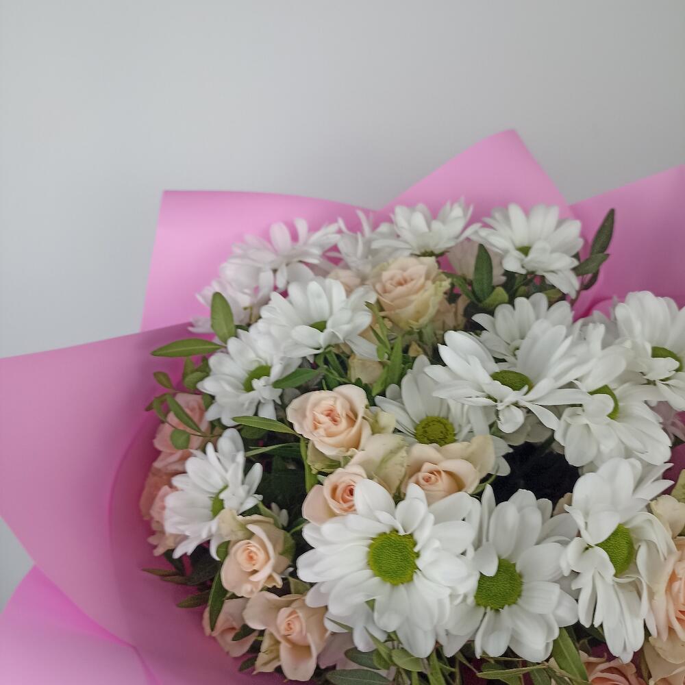 Букет с хризантемами и кустовыми розами