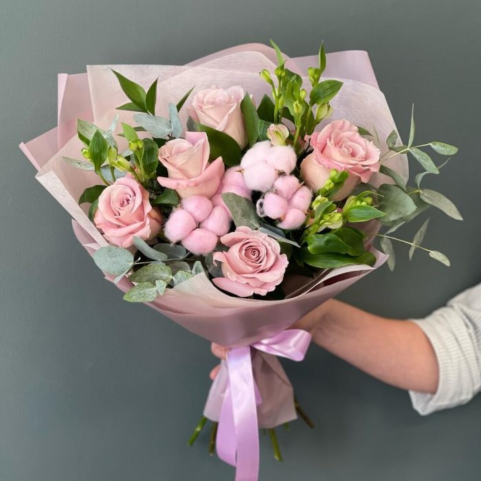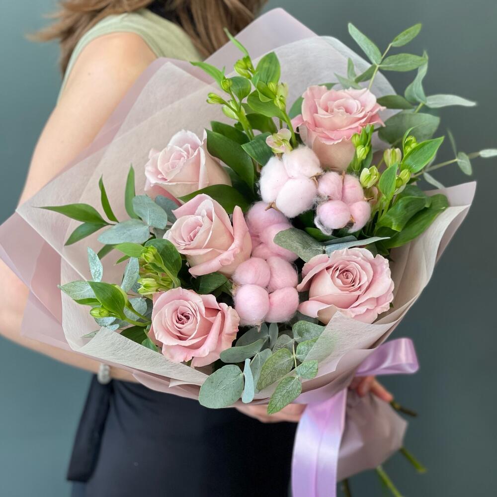 Букет с нежными розами и хлопком “Нежность”