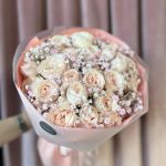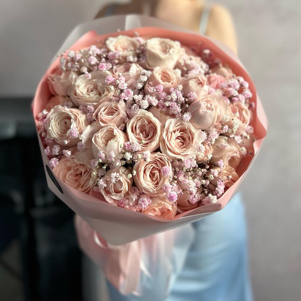 Гипсофила – 9 шт.Кустовая пионовидная роза – 8 шт.декоративная упаковка – 1 шт.Атласная лента – 1 шт.