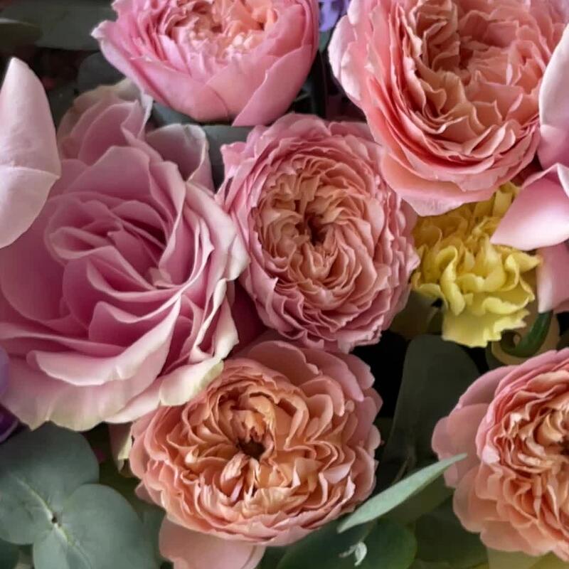 Лента – 2 шт.Маттиола – 3 шт.Эвкалипт – 2 шт.Роза одноголовая – 5 шт.Гвоздика – 5 шт.Упаковка дизайнерская – 2 шт.Кризал (подкормка) – 2 шт.Открытка мини – 1 шт.Роза кустовая джульетта – 3 шт.