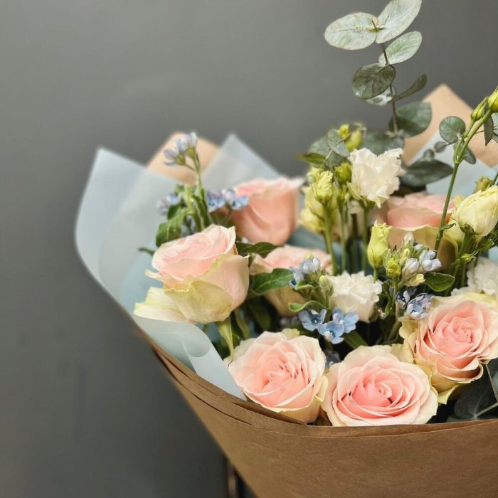 Роза одноголовая – 7 шт.Оксипеталум – 3 шт.Лизиантус – 1 шт.Упаковка дизайнерская – 1 шт.зелень декоративная – 2 шт.