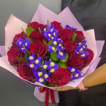 Ирис – 12 шт.Лента – 1 шт.Роза – 13 шт.Зелень – 10 шт.Упаковка – 1 шт.