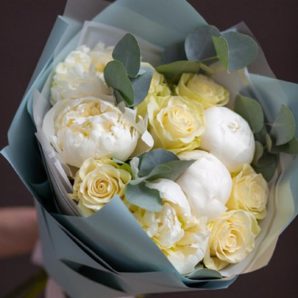 Тишью – 1 шт.Атласная лента – 2 шт.Корейская пленка – 2 шт.эвкалипт cinerea – 4 шт.пион duchess de nemours – 5 шт.кенийская белая роза 50 см – 6 шт.