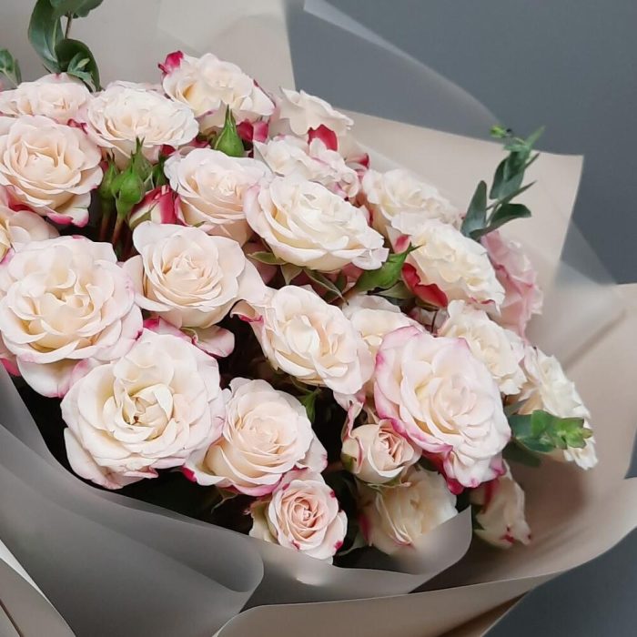 Роза кустовая – 7 шт.Эвкалипт – 2 шт.Упаковка дизайнерская – 2 шт.