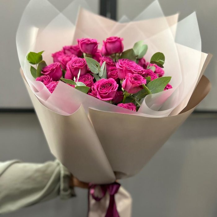 роза кустовая классик сенсейшн – 7 шт.Эвкалипт – 3 шт.Пленка матовая – 5 шт.Лента атласная – 2 шт.