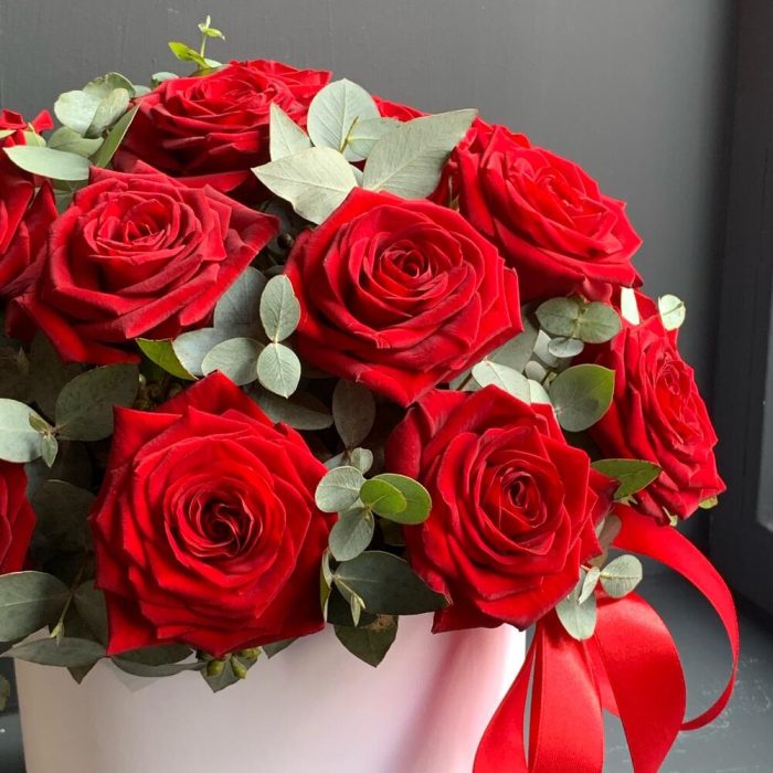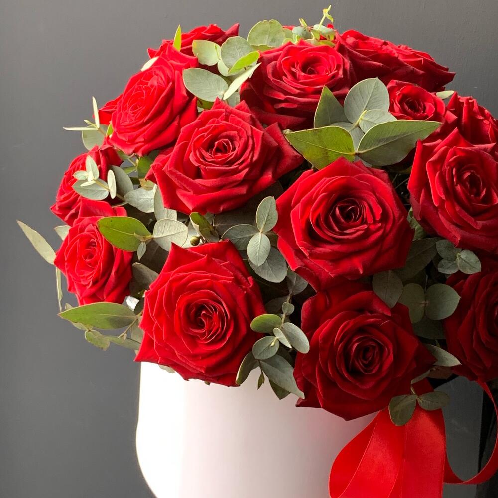 Эвкалипт – 4 шт.Лента атласная – 2 шт.Коробка шляпная – 1 шт.Оазис флористический – 1 шт.роза ред наоми. – 21 шт.