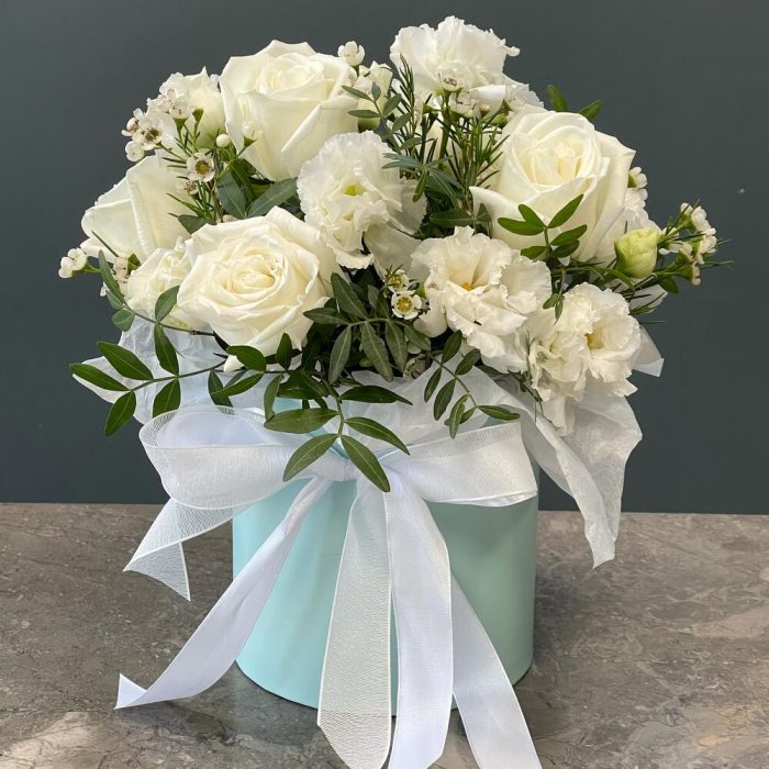 Композиция в шляпной коробке с белыми розами “Белоснежная”