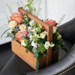 Лизиантус – 4 шт.Маттиола – 2 шт.Эвкалипт – 2 шт.Роза кустовая пионовидная – 3 шт.Скиммия – 3 шт.Гринбелл – 2 шт.Роза садовая – 3 шт.Оксипеталум – 4 шт.Ящик деревянный – 1 шт.Оазис флористический – 1 шт.