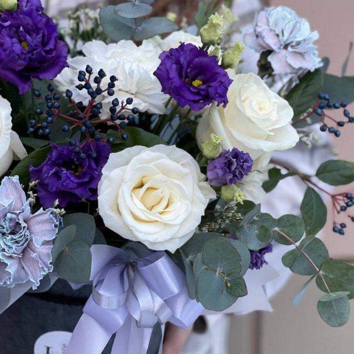 Вибурнум – 3 шт.Эвкалипт – 3 шт.Роза Эквадор – 6 шт.Эустома – 2 шт.Гвоздика белая – 3 шт.Шляпная коробка – 1 шт.Оазис флористический – 1 шт.гвоздика крашенная – 5 шт.