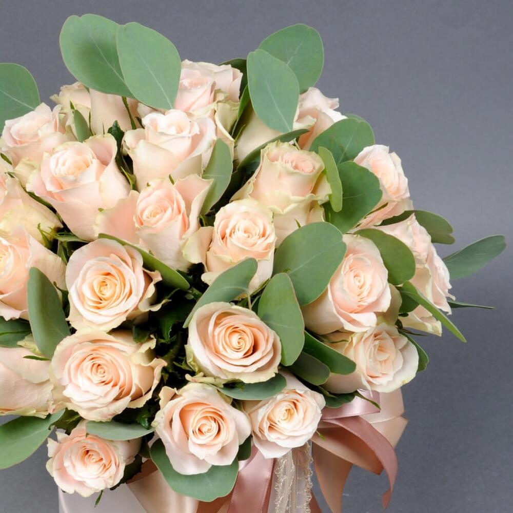 Роза светлая – 35 шт.Эвкалипт – 19 шт.Коробка шляпная – 1 шт.Оазис флористический – 1 шт.работа флориста – 1 шт.