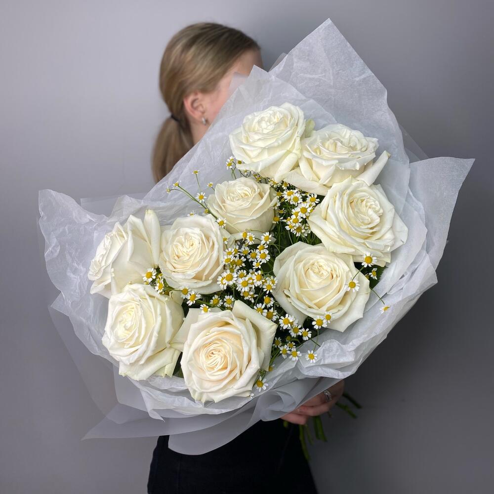 Роза Эквадор – 9 шт.Матрикария – 5 шт.Упаковка дизайнерская – 1 шт.подкормка для срезанных цветов – 1 шт.любовь флориста – 1 шт.записка с вашим текстом – 1 шт.шоколадный медиант ручной работы – 1 шт.советы по уходу за срезанными цветами – 1 шт.