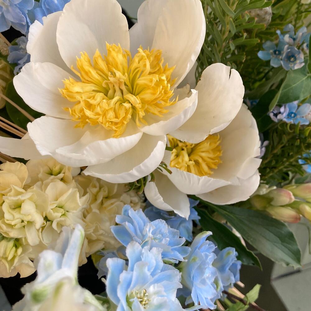 Дельфиниум – 2 шт.Маттиола – 2 шт.Пион – 2 шт.Лента атласная – 1 шт.Оксипеталум – 2 шт.Анигозантус – 1 шт.Львиный зев – 2 шт.Каапс – 2 шт.тубироза – 1 шт.ирландский колокольчик – 1 шт.тимофеевка пучок – 1 шт.