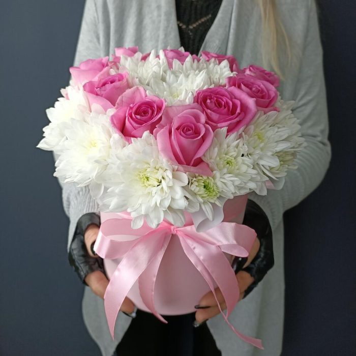 Хризантема кустовая – 4 шт.Роза – 10 шт.Шляпная коробка с лентами – 1 шт.