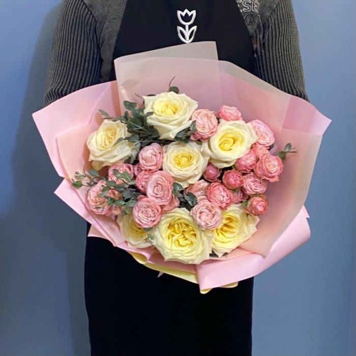 роза пионовидная candelight – 7 шт.Роза кустовая пионовидная – 5 шт.Эвкалипт – 3 шт.Упаковка – 1 шт.Лента атласная – 1 шт.