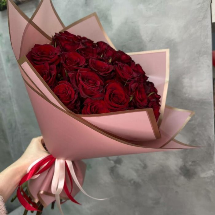 Роза эквадор 50 см – 25 шт.Упаковка дизайнерская – 3 шт.Лента атласная – 2 шт.