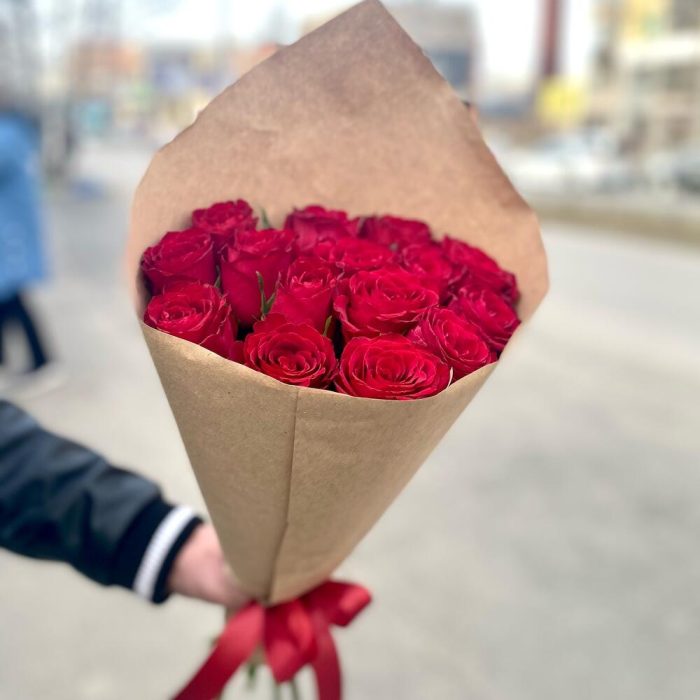 Роза красная – 15 шт.Лента атласная – 1 шт.Крафт упаковка – 1 шт.