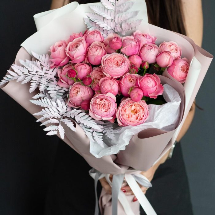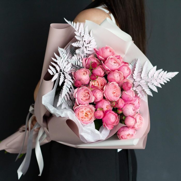 пионовидные кустовые розы сильвия пинк – 7 шт. Зелень крашеная – 3 шт.