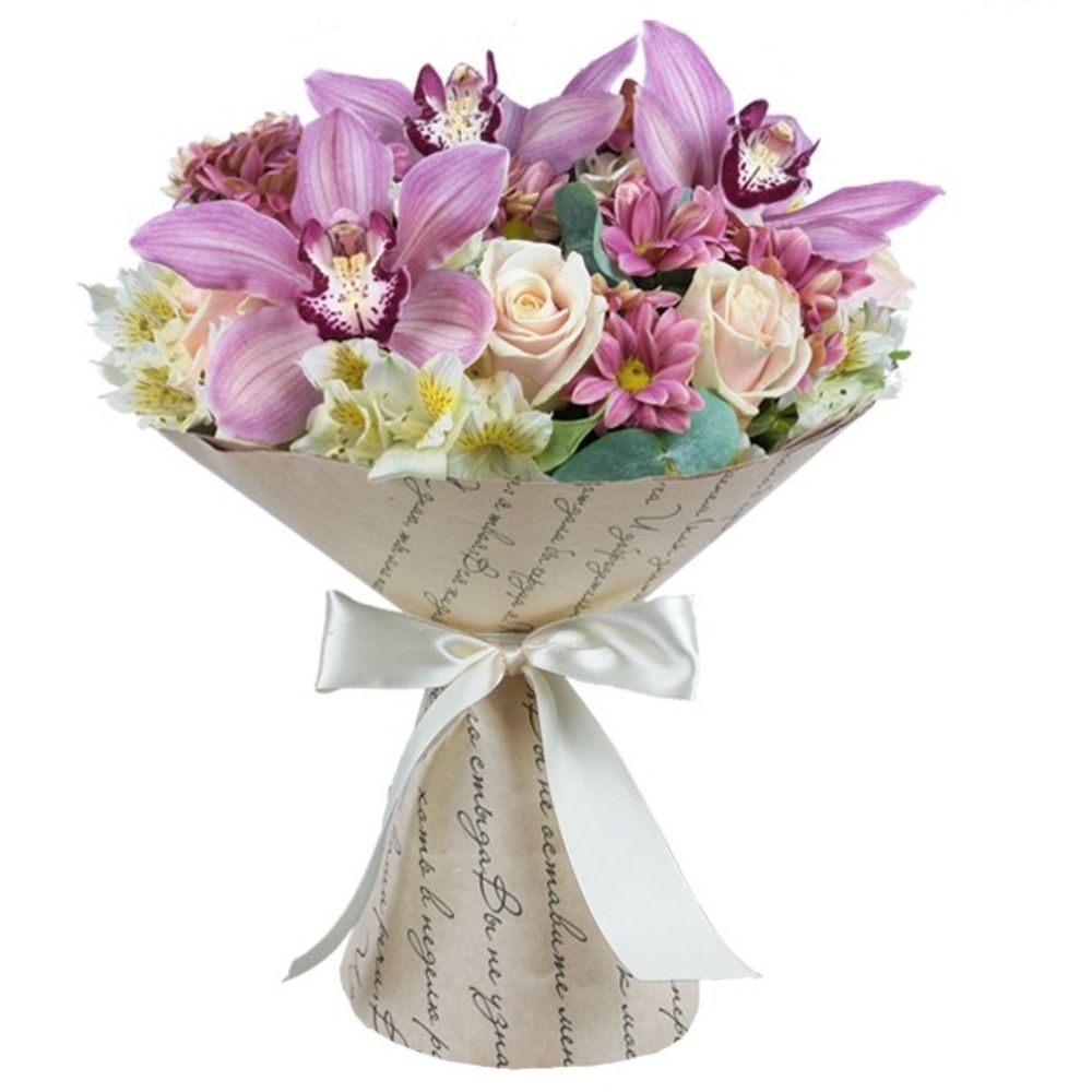 лента декоративная – 1 шт.бумага упаковочная – 1 шт.Эвкалипт – 1 шт.Цимбидиум розовый – 3 шт.Хризантема кустовая розовая – 4 шт.Роза кремовая – 7 шт.Альстромерия кремовая – 6 шт.