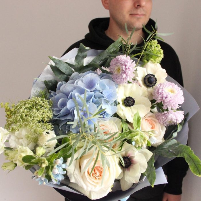 Амми – 2 шт.Анемон – 3 шт.Астра – 3 шт.Гортензия – 1 шт.Лизиантус – 2 шт.Эвкалипт – 3 шт.Упаковка – 2 шт.Лента атласная – 1 шт.Роза пионовидная – 3 шт.Твидия – 2 шт.флебодиум – 2 шт.