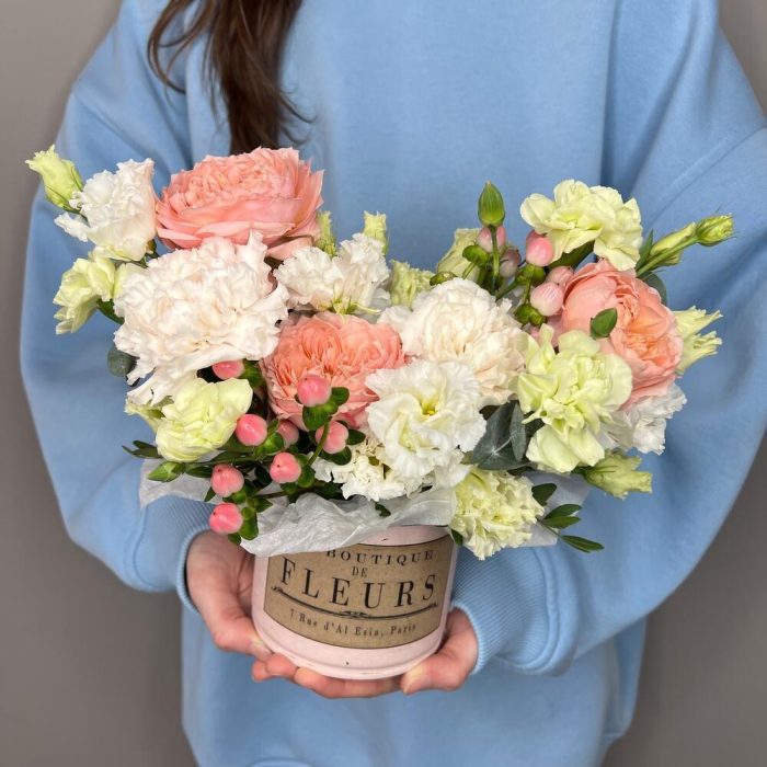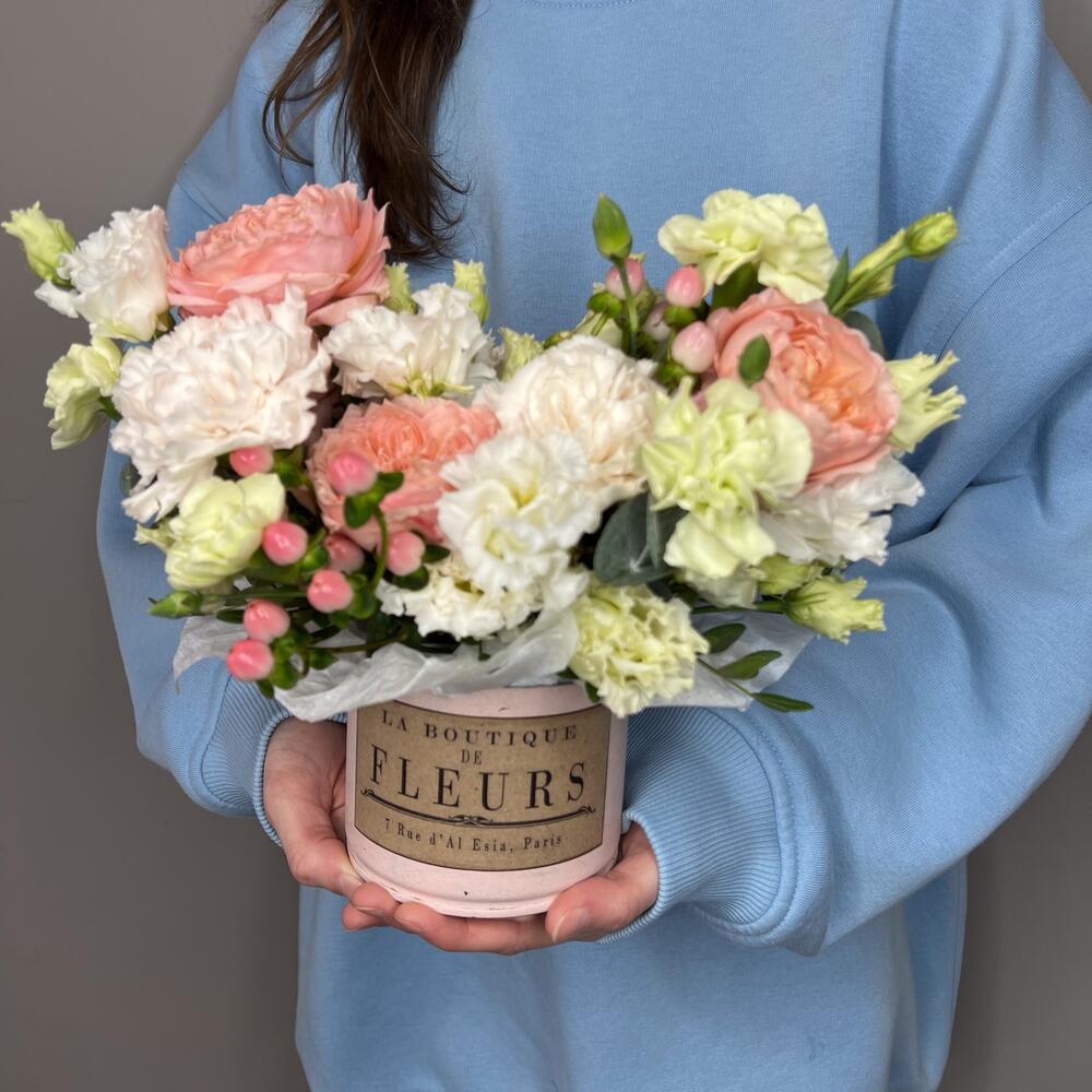 Гиперикум – 2 шт.Лизиантус – 1 шт.Кашпо – 1 шт.Диантус – 3 шт.Роза кустовая пионовидная – 1 шт.комплимент от polyanka – 1 шт.