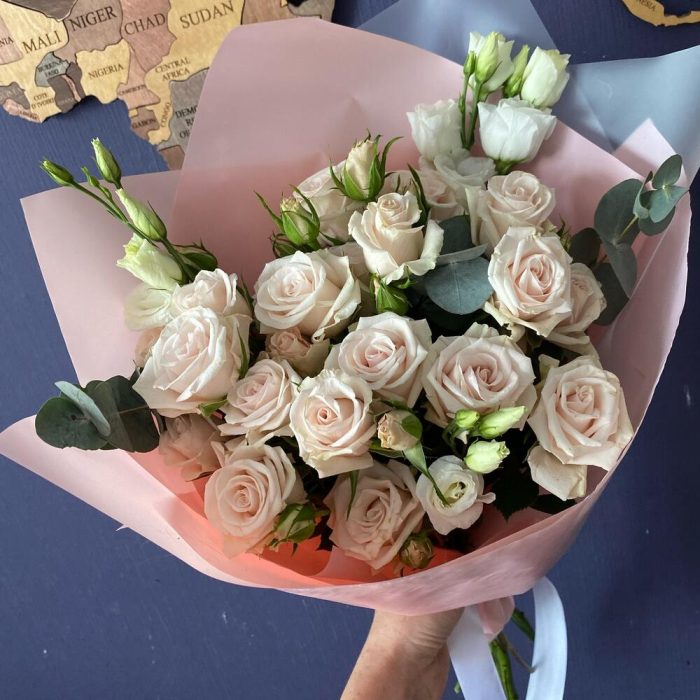 Роза кустовая – 5 шт.Лизиантус – 4 шт.Эвкалипт – 3 шт.Матовая пленка – 4 шт.Лента атласная – 1 шт.