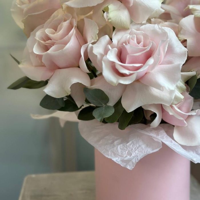 Роза одноголовая – 11 шт.Эвкалипт – 11 шт.Коробка шляпная – 1 шт.Пена флористическая – 1 шт.