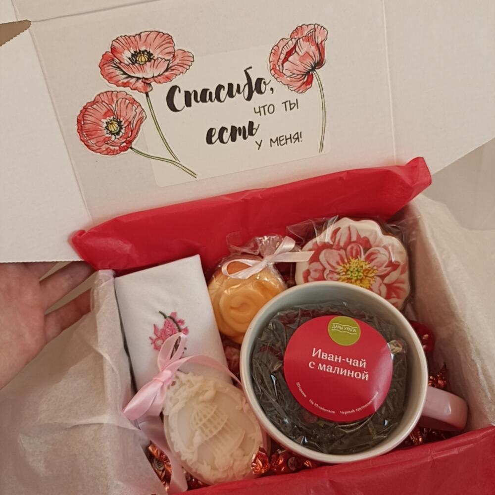 Оригинальный подарочный набор с тем, что может удивить и порадовать любимого человека ❤В подарочный бокс входит:- Иван-чай, собранный в далекой Сибири вручную, с кусочками малины и без ароматизаторов- Кружка (400 мл)- Шоколадные конфеты (3 шт)- Мягкое мыло ручной работы «Роза» (подходит для ухода за кожей лица и нежной детской кожей)- Ароматное саше из воска с запахом «Манго-бергамот»- Пряник ручной работы «Пион» (без меда)- Хлопковый платочек с вышивкой- Choco-Pie с клубникой (2шт)- Трюфельные конфеты в корпусной оболочкеНабор упакован в подарочную упаковку алого цвета и крафтовую коробку с рисунком маков и надписью «Спасибо, что ты есть у меня!» ❤Наши необычные подарки придутся по душе каждой дочке, жене, маме, бабушке, любимой девушке или коллеге. Также поможем удивить отцов, дедушек, сыновей или внуков. Ведь пол и роль не важны, зато бывает так важно подарить чуточку внимания и тепла) А у нас есть все, чтобы Вам с этим помочь ❤Вы можете изменить состав подарочного бокса: -добавить открытку в конверте или без, в которой мы напишем Ваше поздравление- выбрать имбирные пряники с поздравлениями или просто с красивой картинкой- дополнить подарок чаем, брошками, сумками-шопперами, блокнотами, макаронс, кремами, масками для лица, мылом ручной работы- заменить то, что есть в набореДля этого пишите нам Если Вы добавляете позиции к набору, мы бесплатно поменяем упаковку размером побольше и оформим в том же стиле, что и упаковка в товаре. Обязательно пришлëм фото по готовности К каждому заказу кладëм сладкий комплимент. Можем собрать набор, оформить коробку или крафтовую объëмную фигуру, подобрать подарки в цвет, на любую сумму индивидуально для Вашего торжества