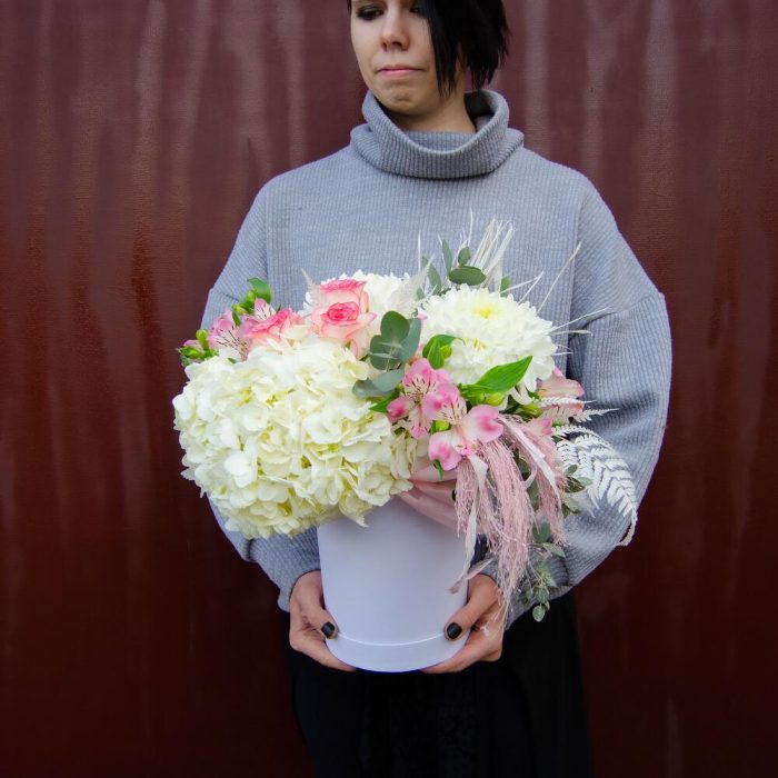 Гортензия – 1 шт. Роза – 3 шт. Альстромерия – 3 шт. Циперус – 2 шт. Папоротник – 1 шт.