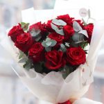 алые розы эквадор – 11 шт.Дизайнерская упаковка – 1 шт.Эвкалипт – 4 шт.