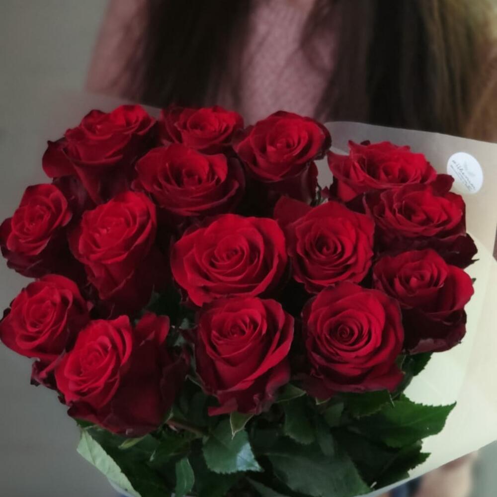 15 классических роз сорта Explorer (Эксплорер) в моно-букетеСорт отличается насыщенным бордовым оттенком бутона и стойкостьюБукет оформлен упаковкой и атласными лентами