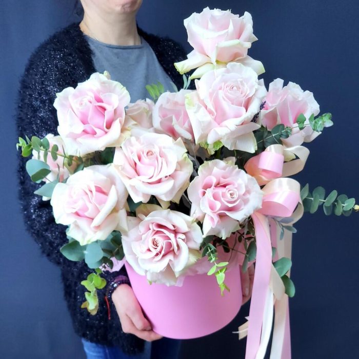 Шляпная коробка с кустовыми пионовидными розами «Мисти»