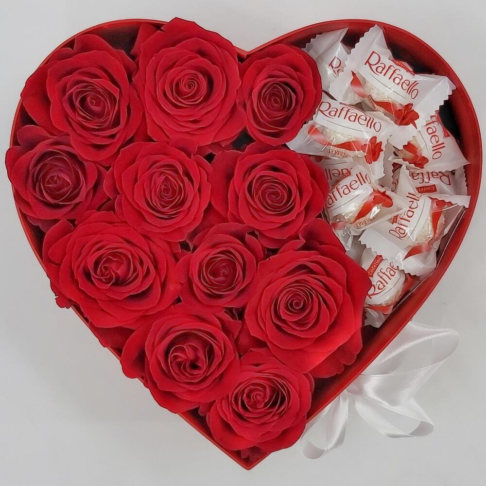 Роза Эквадор Премиум – 11 шт.Конфеты Raffaello – 150 гр.Коробка сердце – 1 шт.Лента атласная – 1 шт.Флористическая губка (оазис) – 2 шт.