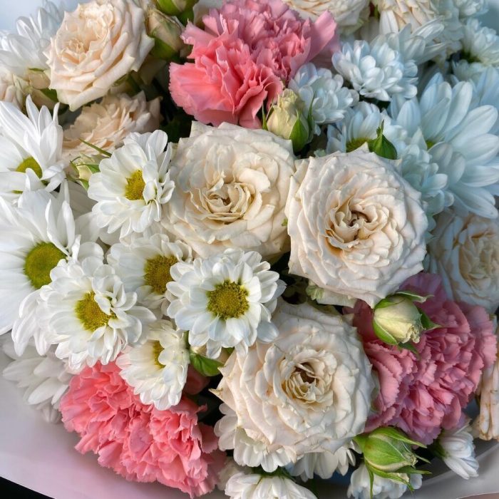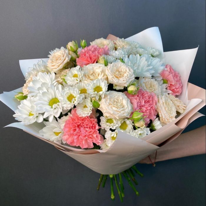 роза кустовая таня – 3 шт.Диантус сортовой – 5 шт.Хризантема кустовая белая – 3 шт.Сантини белая – 5 шт.Упаковка дизайнерская – 1 шт.