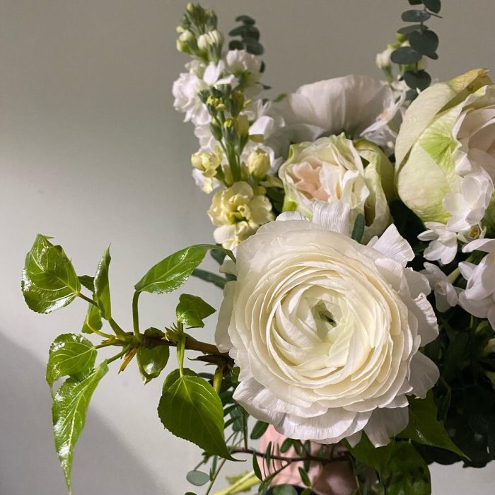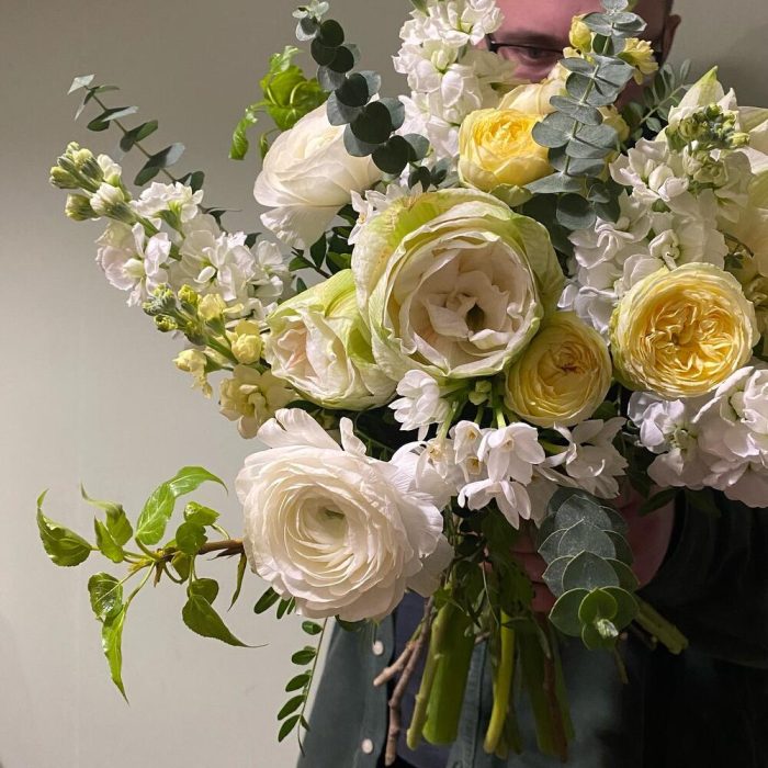 Амариллис – 2 шт.Нарцисс кустовой – 3 шт.Ранункулюс – 4 шт.Маттиола – 7 шт.Роза пионовидная кустовая – 3 шт.Эвкалипт – 9 шт.Ветки – 2 шт.Сирень белая – 2 шт.