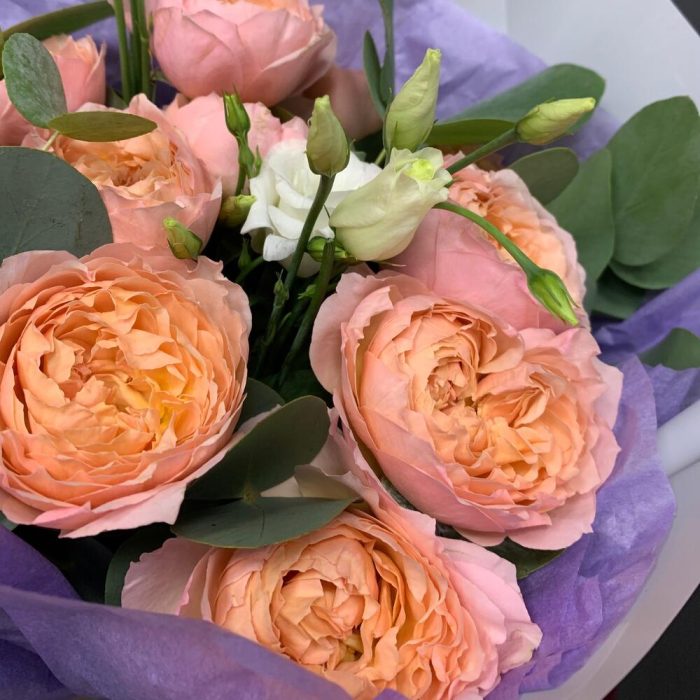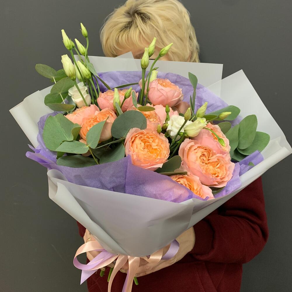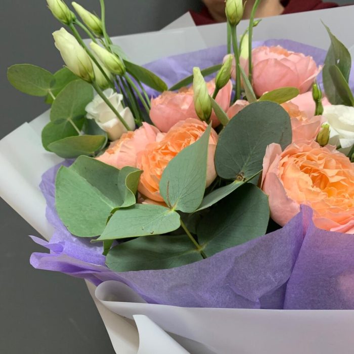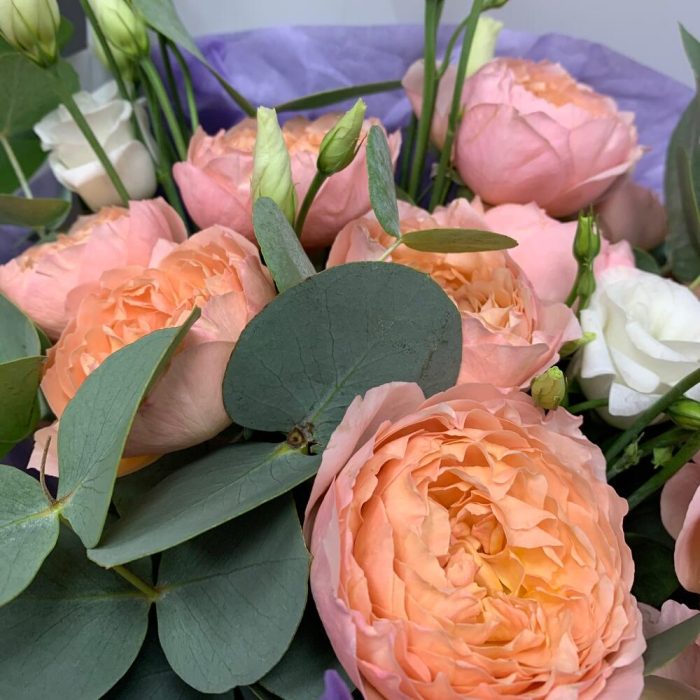 Эвкалипт – 5 шт.Лента атласная – 2 шт.Тишью – 1 шт.Лизиантус белый – 3 шт.Упаковка корейская пленка – 1 шт.роза кустовая пионовидная премиум джульетта – 3 шт.
