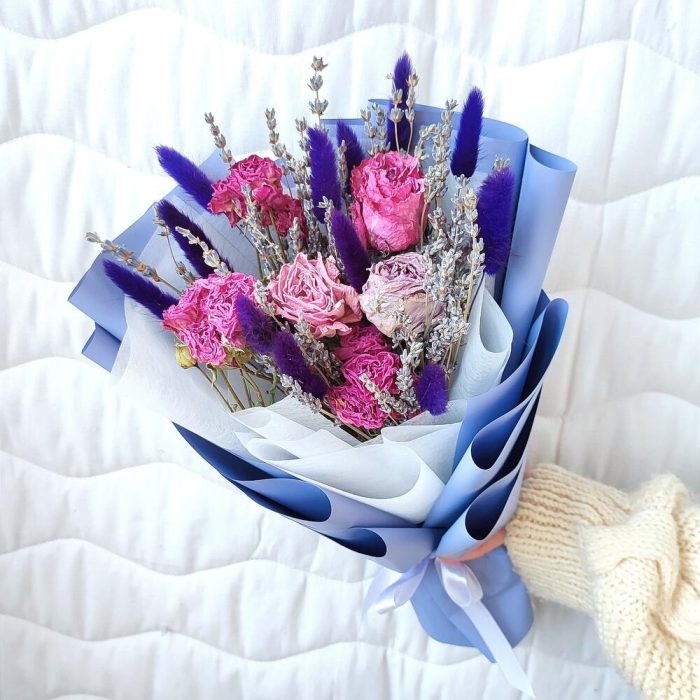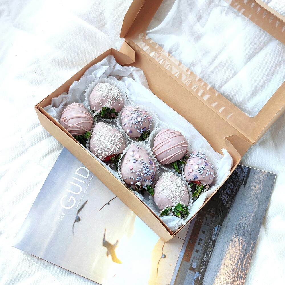 Лаванда (сухоцвет) пучок – 1 шт.Клубника в шоколаде – 8 шт.лагурус (сухоцвет) пучок – 1 шт.розы сухоцвет микс – 1 шт.
