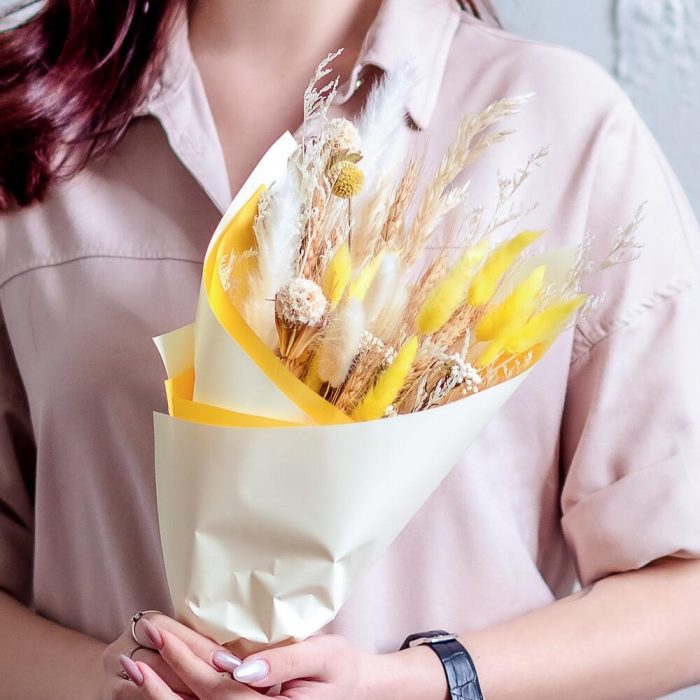 Краспедия – 1 шт.Упаковка дизайнерская – 1 шт.Лагурус – 2 шт.Скабиоза сухая – 2 шт.Тритикале – 1 шт.лимониум стабилизированный – 1 шт.озотамнус стабилизированный – 1 шт.ампелодесмос – 1 шт.кисточки пампасной травы – 2 шт.
