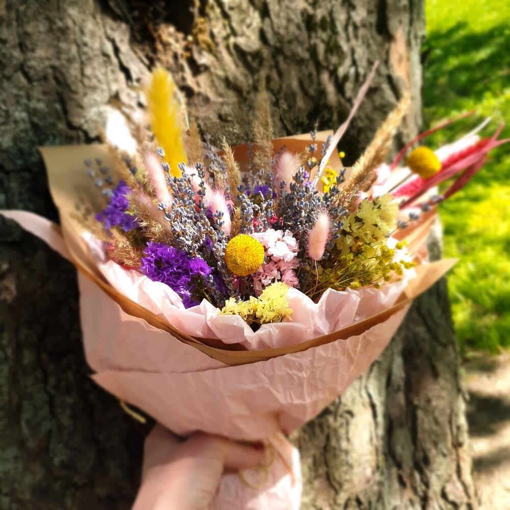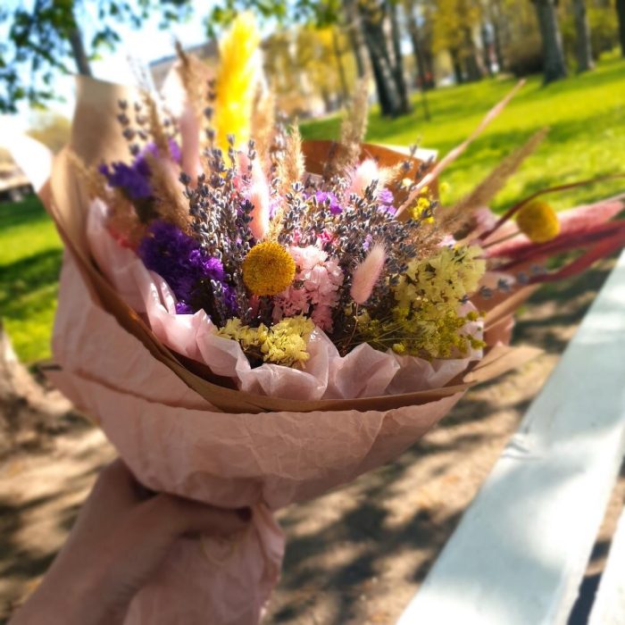 Колоски – 11 шт.Крафт упаковка – 2 шт.Лаванда (сухоцвет) пучок – 1 шт.Шпагат джутовый – 1 шт.гипсофила сухоцвет ветка – 1 шт.лагурус (сухоцвет) розовый – 7 шт.статица синяя сухоцвет – 3 шт.статица желтая сухоцвет – 2 шт.розы сухоцвет микс – 3 шт.краспедия желтая сухоцвет – 2 шт.статица розовая сухоцвет – 1 шт.