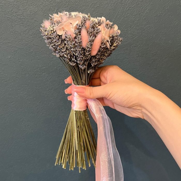 лавандин сухоцвет – 1 шт.Хлопок натуральный – 1 шт.Лагурус (сухоцвет) – 20 шт.гортензия стабилизированная – 5 шт.озотамнус стабилизированный – 5 шт.