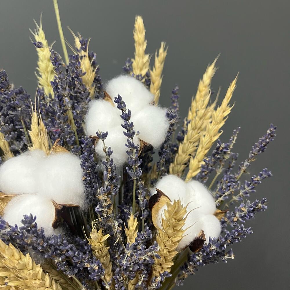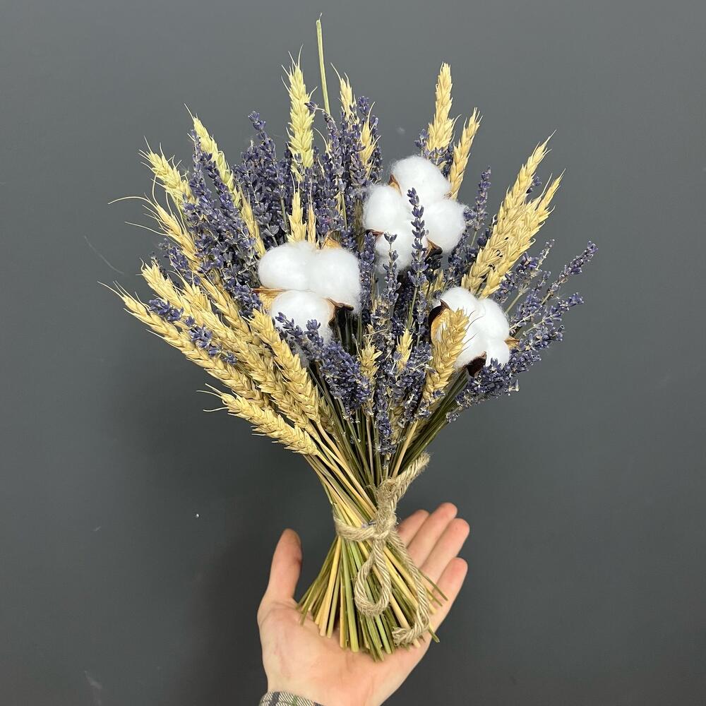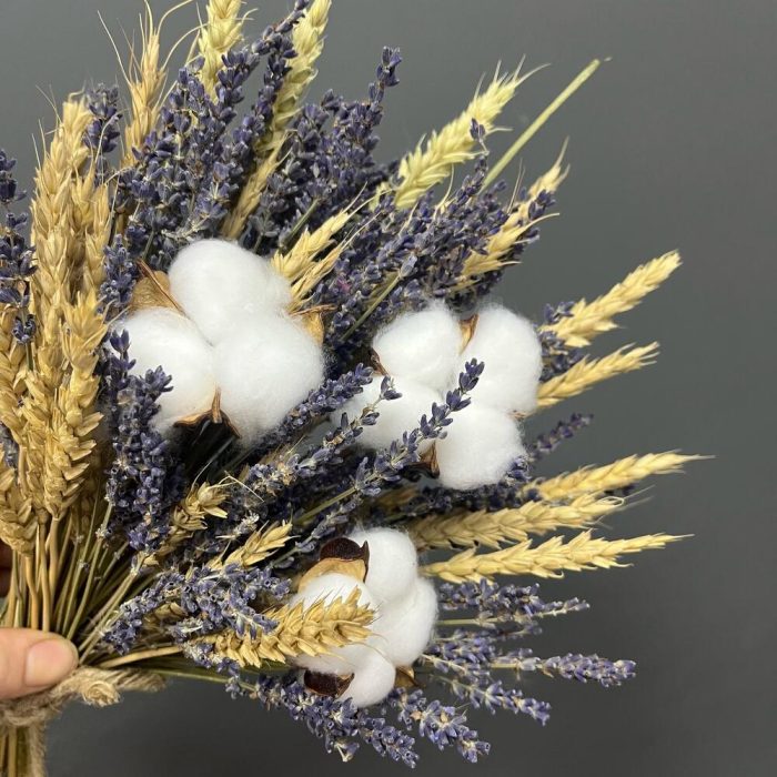 Хлопок натуральный – 3 шт.бечевка натуральная – 1 шт.лаванда сухоцвет банч – 1 шт.пшеница (сухоцвет) банч – 1 шт.