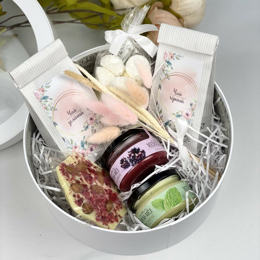 крем-мед 100мл – 2 шт.Чай черный – 50 гр.Чай зеленый – 50 гр.пакетик с разноцветным безе – 1 шт.шоколад ручной работы с ягодами и орехами – 70 гр.букетик сухоцветов – 1 шт.