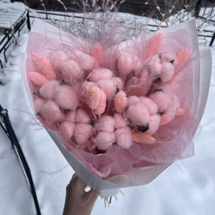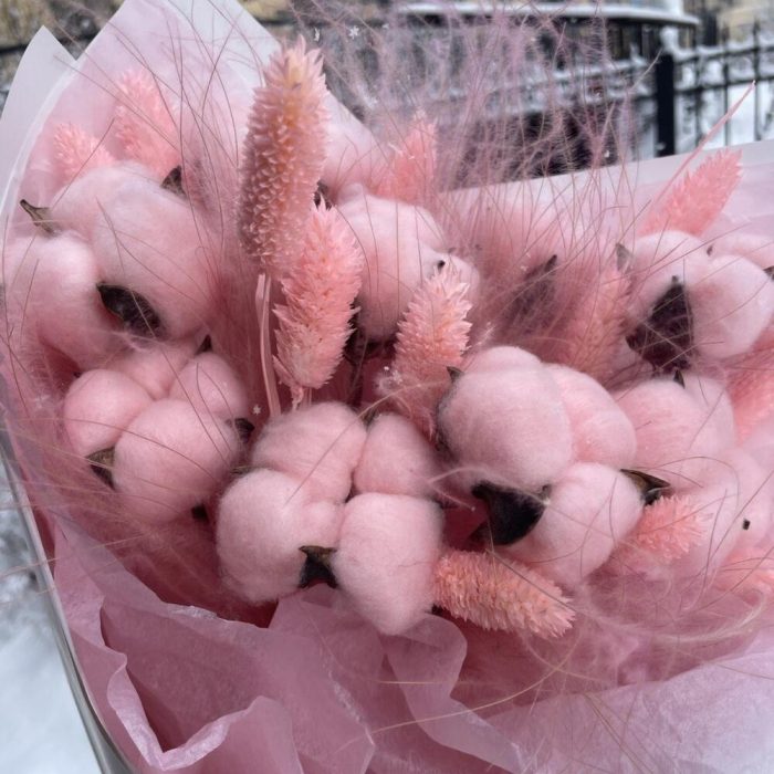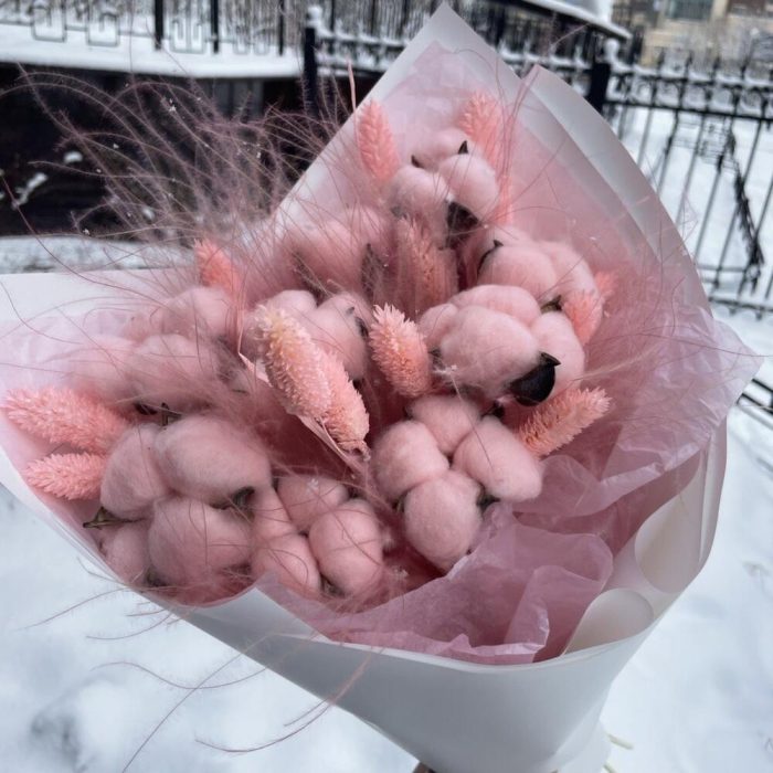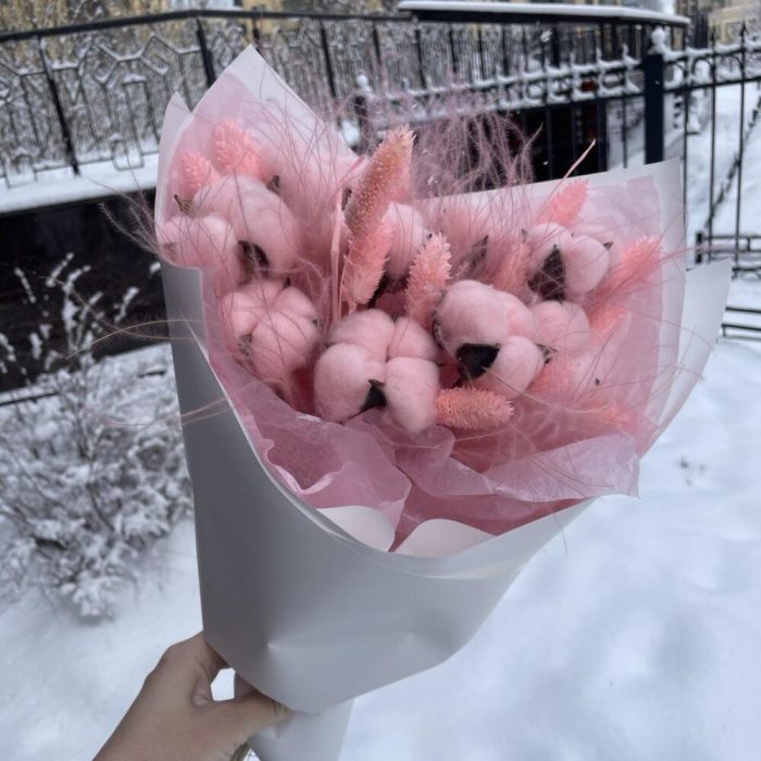 Хлопок натуральный – 9 шт.Фаларис – 13 шт.ковыль связка – 6 шт.Упаковка дизайнерская – 6 шт.Лента атласная – 1 шт.