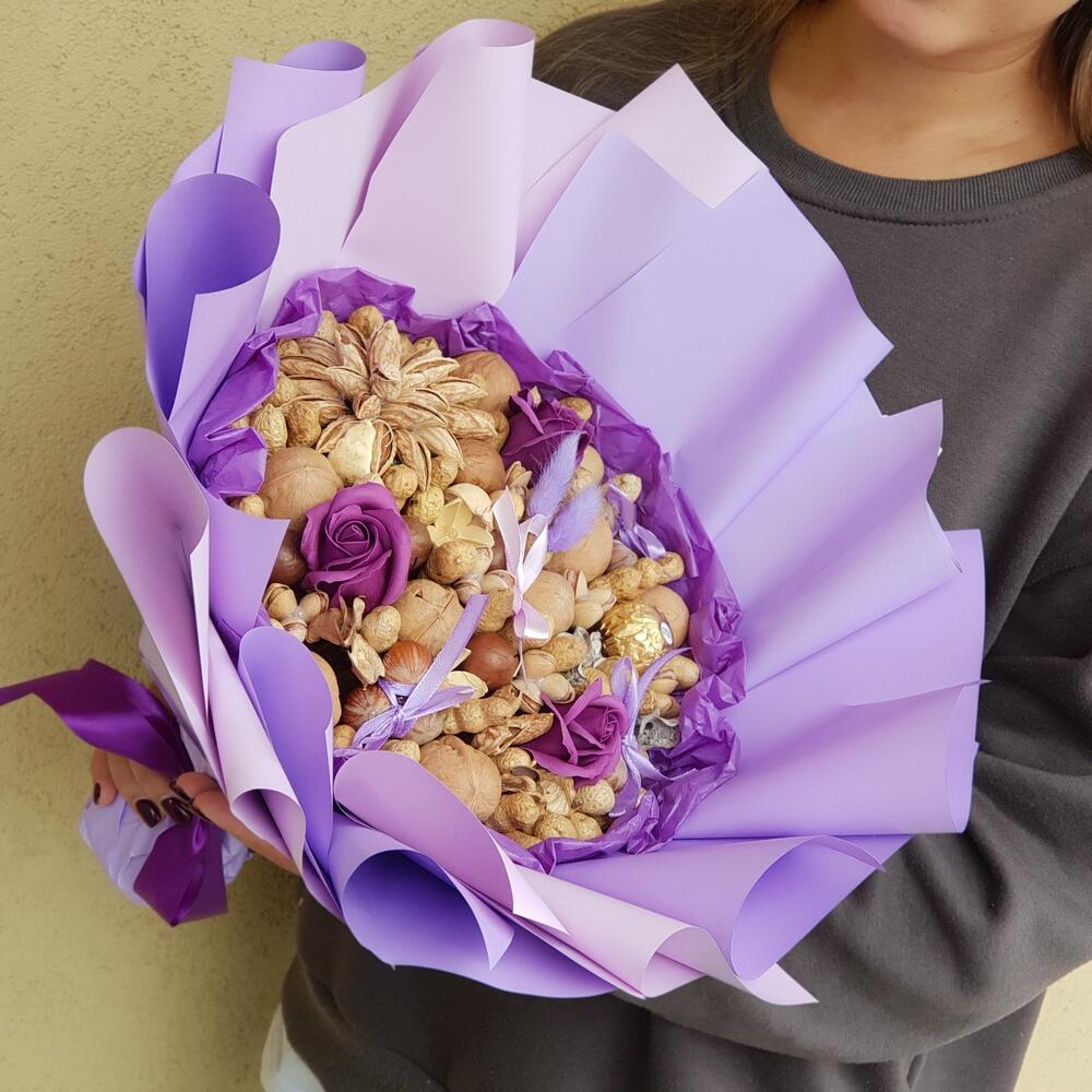 мыльные розы – 3 шт.Грецкий орех – 115 гр.Фундук – 25 гр.Фисташки – 18 гр.макадамия – 20 гр.Миндаль – 40 гр.конфета роше – 1 шт.пекан – 16 гр.арахис в скорлупе – 65 шт.Лагурус – 2 шт.дополнительный декор – 5 шт.